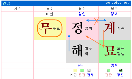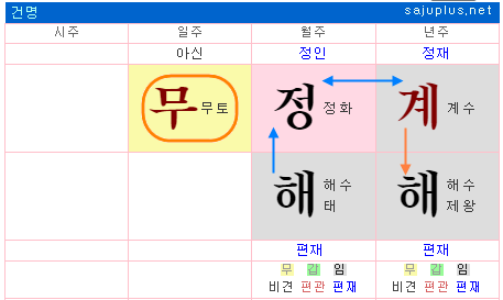 부친인 연간 계수와 모친인 월간 정화가 나란히 하면서 극관계를 이루고 있습니다. 다만, 연간의 계수는 앉은자리 통근을 하지 못하지만, 계수가 생하는 묘목이 온 경우입니다. 이렇듯 동주하는 천간이나 지지에 자신이 생조해야 할 오행이 오게 되면 이웃하는 오행을 충하는 것 보다 생조가 먼저 이루어집니다.