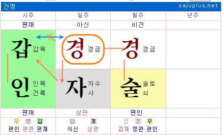 그런데 시간의 갑목도 시지의 동조를 받아 힘이 강합니다. 또한 시간의 갑목은 편재로 일간 경금의 아내입니다. 원만한 부부생활을 이어가지만, 음양의 부조화로 인한 마찰은 있다고 봅니다.