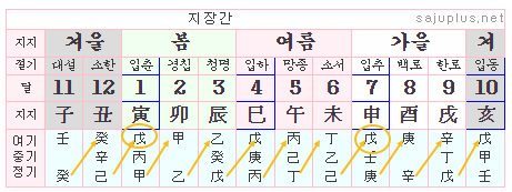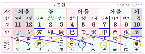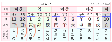 위 도표는 각 달의 지지에 따른 지장간(아랫쪽의 연한 하늘색 부분)을 표시한 것입니다. 지장간은 위쪽부터 여기, 중기, 정기를 표시한 것입니다. 축월의 여기는 계수입니다. 지난 달의 본기인 계수가 그대로 이달의 여기가 되고, 인월의 여기는 축월의 본기인 토오행이 그대로 넘어온 것입니다.