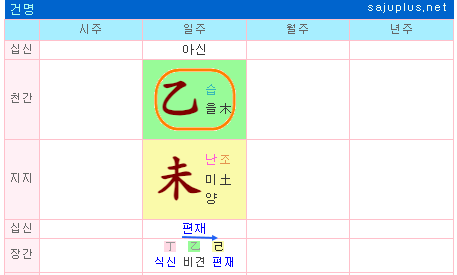 또한, 부부간에 한몸을 이루어 인연은 깊으나 음양이 조화되지 못해, 정은 크다고 보기 힘듭니다. 아내는 미토의 지장간 속의 기토입니다. 기토가 같은 지장간의 을목의 극을 받는 경우라, 다른 남자에게 한눈을 팔 수도 있다고 봅니다. 이러한 이유로 인해 을미일주는 배우자를 극한다는 백호살에 해당합니다.