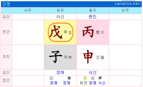 이번에는 무토일간의 남명사주입니다. 일지 자수는 일간 무토와 한몸을 이루고, 일간이 목극토로 득하는 정재입니다. 또한, 일간 무토와 일지 자수의 지장간 계수는 무계 명암합의 관계라 부부간에 인연도 있고, 정도 크다고 봅니다. 이런 명조에서 월간에 편인인 병화, 월지는 식신인 신금이 위치합니다. 월주의 육친은 어떻게 배정할까요?