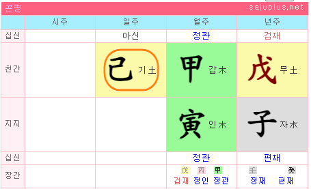 기토일간의 여명사주입니다. 월주가 정관 갑인으로 기토여성의 남편입니다. 여기까지는 누구나 쉽게 육친 관계를 확인할 수 있습니다. 그렇다면 연간에 있는 겁재 무토와 연지에 있는 편재 자수는 육친적으로 어떻게 해석해야 할까요? 연간은 겁재로 오빠, 연지는 편재로 부친으로 보면 어떨까요?