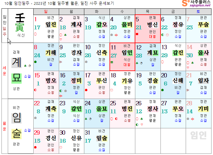 임수일간 10월운세-2023년 10월(임술월) 일주운세 월운세, 일진운세 사주보기 운세보기