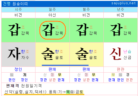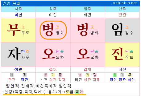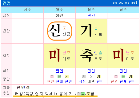 위 명조의 경우 월지 득령, 일지 득지로 50점에 해당하고, 월간 10점, 연지 7점으로 신강한 사주입니다. 참고로 월지와 일지가 인성이나 비겁이면, 그대로 신강사주로 보셔도 됩니다.