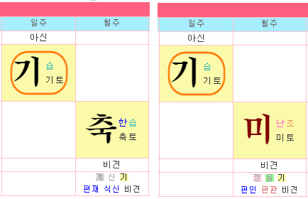 위 그림의 두명조는 모두 기토일간의 여명사주로, 월지가 모두 비견인 토오행입니다. 그러나, 좌측 명조는 가장 추운 계절인 축월에 태어난 기토라, 언땅을 녹여줄 화오행인 인성을 향하게 되고, 우측의 명조는 가장 더운 미월에 태어난 경우라 메마른 땅을 적셔줄 물기운인 재성을 향하게됩니다.