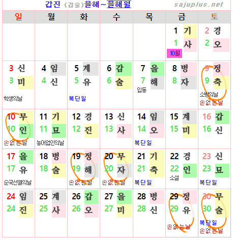 ❚ 양력 2024년 10월의 [손없는날]