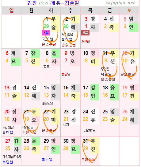❚ 양력 2024년 8월의 [손없는날]