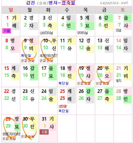❚ 양력 2024년 12월의 [손없는날]