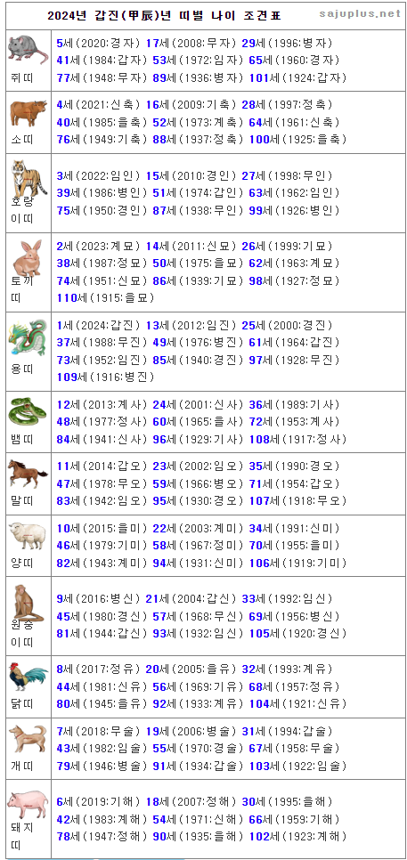 2024년 갑진(甲辰)년 띠별 나이 조견표