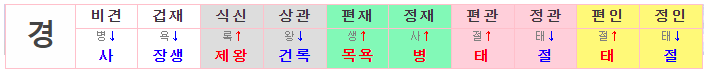 비견이 사지라 자신감이나 자존심, 건강에 문제가 따르기 쉬우니 주의해야 합니다. 또한, 겁재가 장생이라 고집이나 이기심이 대단하고, 지나친 자신감으로 인한 충동도 생기지만 자제해야 합니다.