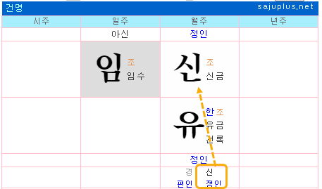 월간에 정인이 투출하고 정인격을 이루는 명조의 경우입니다. 일간은 심리적으로 안정되어 여유가 있고, 명예나 체면을 중시합니다. 정인격은 정관격과 유사한 성향을 나타낸다고 볼 것입니다.