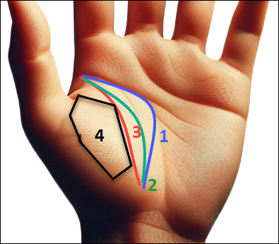 위 그림은 생명선인 엄지 손가락을 중심으로 휘어지는 각도와 넓이를 표시한 것입니다. 그리고, 4번은 엄지 손가락 옆에 통통하게 솟아 오른 살집 부분을 말하며, 금성구라고 합니다.