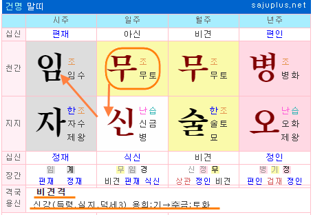 여기서 일간이 바라는 기본적인 마음을 대입시켜야 합니다. 위 명조에서 일간 무토는 주변환경이 불량하여 나무를 키울 수 없는 땅이지만, 나무를 키워야 하는 것이 기본 역할입니다. 또한, 자신의 본성은 흙이라 흙과 나무를 이용한 토목이나 건축분야에서 사업을 하면, 만족도가 높은 명조입니다.