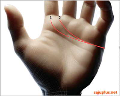 ①번과 같이 검지 손가락 아랫 부분인 목성구까지 감정선이 길게 뻗어 있는 경우는, 감정의 기복이 적어 신뢰할만한 사람으로 봅니다.