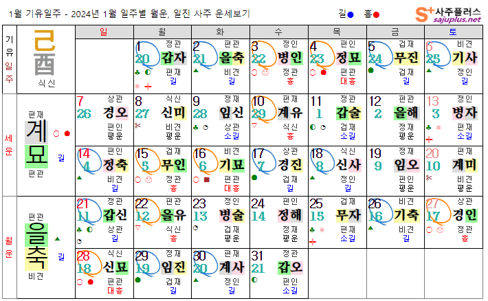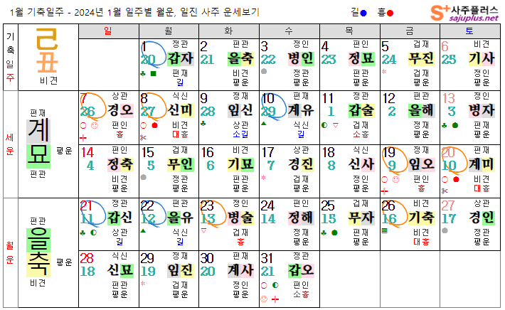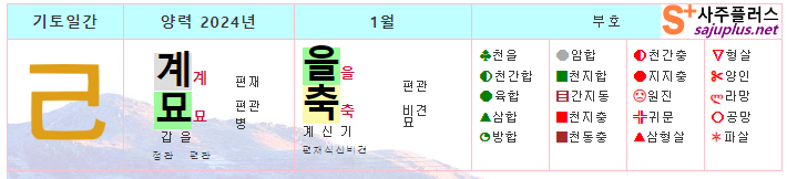 기토일간 1월운세-2024년 1월(을축월) 일주운세 월운세, 일진운세 사주보기 운세보기