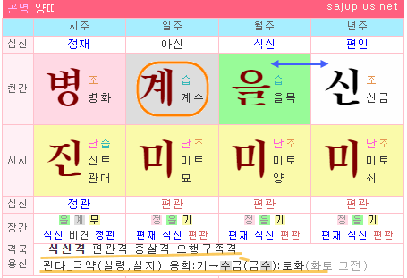 이 경우 일간은 화오행이나 토오행으로 인한 흉신병이 심한 것으로 봅니다. 재성인 금오행은 시모에 해당하고, 관성인 토오행은 남편에 해당합니다. 남편과 시모와의 갈등으로 심장병, 위장병, 비장질환 등이 따를 수 있는 명으로 봅니다.