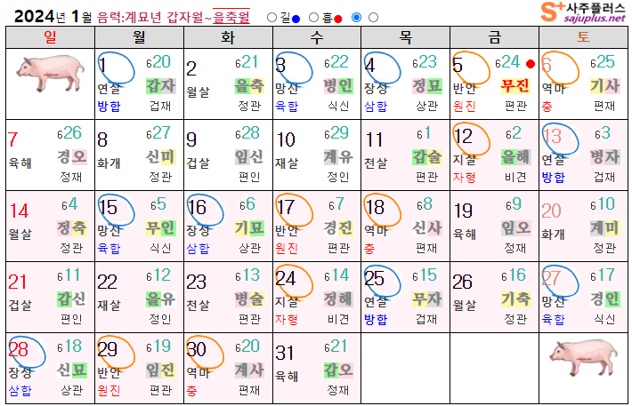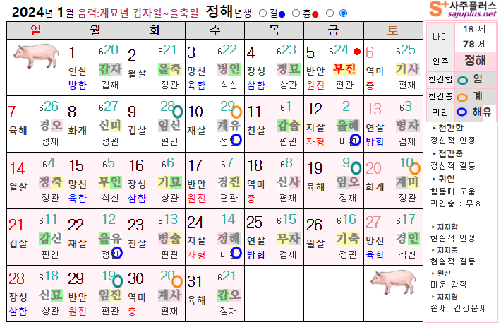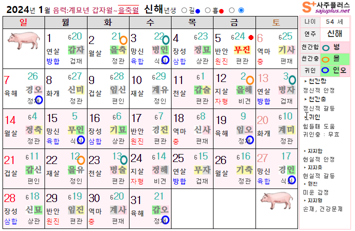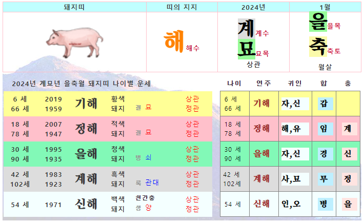1월 돼지띠 운세 - 2024년 1월 계묘년 을축월 띠별 연령별 사주 운세보기