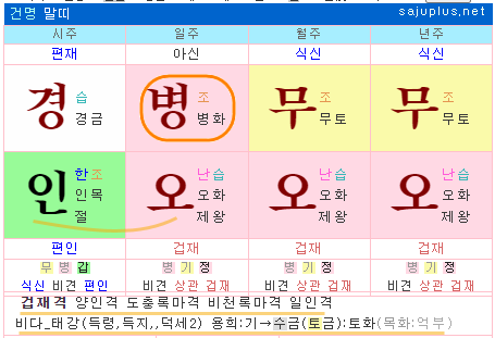따라서, 이 명조의 경우는 금오행과 토오행, 수오행에 관련된 장부에 이상이 따르기 쉽고, 잦은 병마로 인해 단명하기 쉽다고 판단을 합니다.