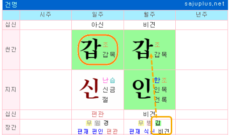 위 예제 명조가 신강한 명조라면, 일지 비겁이 흉신이면서 시주로 유통이 되지 못한다고 볼 수 있습니다. 이러한 명조의 경우, 아내와 불화나 갈등에 상당히 유의해야 합니다.