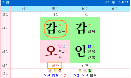 아내궁인 일지가 흉신이면 아내와 불화와 갈등이 많을 수 있고, 운이나 아내의 사주에 따라 파경을 맞는 경우도 생깁니다. 다만, 일지 십성이 시지 식상으로 유통이 되는 경우라면, 중년까지는 제물운과 가정이 불안하지만, 노년이 되면서 점차 좋아지게 됩니다.
