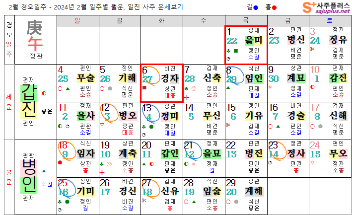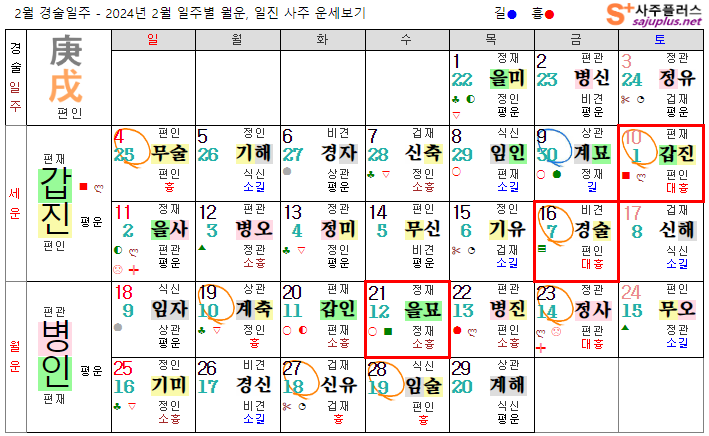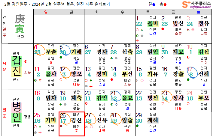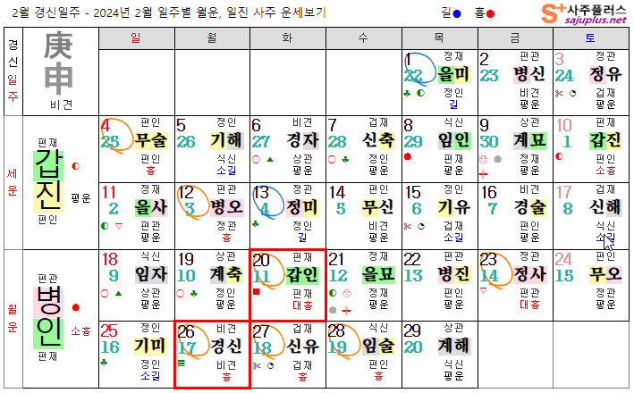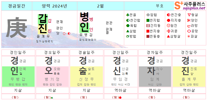경금일간 2월운세-2024년 2월(병인월) 일주운세 월운세, 일진운세 사주보기 운세보기