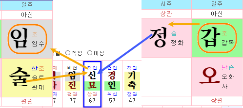 대운의 지지 을목은 동주한 신금으로부터 금극목으로 극을 받는 입장이지만, 지지의 경우는 좀 더 현실적인 부분이 강해, 다소간의 역할이 가능합니다. 만약, 원국에 천간의 신금과 을목을 통관시키는 수오행이 있다면, 완전한 을목의 역할을 수행하게 됩니다.