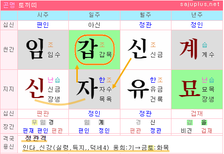 월간의 신금은 앉은자리 통근을 하여 강한 힘을 가지면서, 육친으로는 일간 갑목의 남편입니다. 월간 신금은 일간갑목과 합을 이루지는 못했지만, 부부간에 음양이 조화되어 부부간에 정이 있고, 또한 일간 바로 윗자리에 위치하여 인연도 깊다고 봅니다.