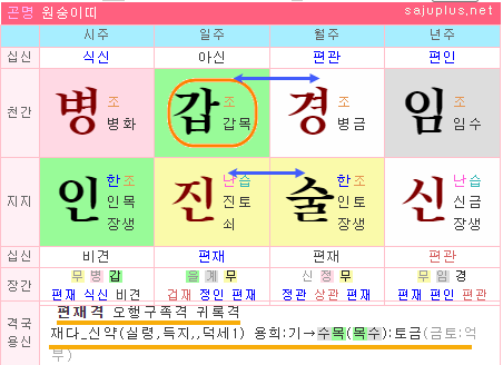 따라서, 남편과는 갈등과 충돌로 해로하기 힘듭니다. 물론, 연간에 인성인 임수가 위치하지만, 갑목과 경금 사이를 직접 통관시키지 못하는 경우입니다. 또한, 재성은 일지와 월지에서 진술충을 이루고 있어, 재성인 시모나 재물과도 인연이 약하다고 봅니다.