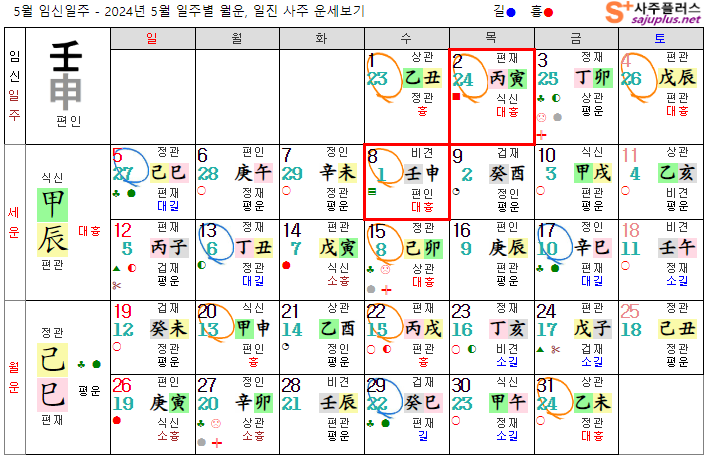 임수일간의 2024년 5월달 일진입니다. 중요한 날, 특히 주의해야 하는 날만 표시해 드리니, 하단의 합,충,형,원진 등의 도표와 첨부한 링크를 참조하셔서 확인하시기 바랍니다.
