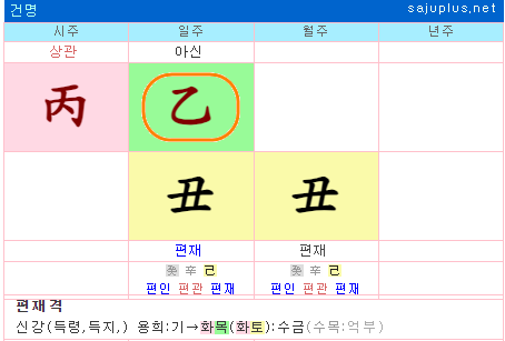 그러나, 축월은 겨울 중에서도 가장 추운 달입니다. 또한 축토 속에는 계수가 있어 언땅입니다. 인성인 수오행을 용신으로 하게 되면, 일간 을목에게 도움이 되는 것이 아니라, 오히려 을목을 얼려 죽이는 결과가 생깁니다. 따라서, 이 경우는 조후상 용신인 화오행이 길신에 해당합니다.