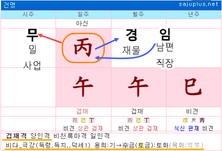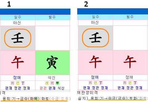 월지 인목은 임수일간의 모친궁으로 오화 여성에게는 시모에 해당합니다. 시모에 해당하는 월지가 일지와 인해합의 관계이면서 목생화로 도움을 주는 경우라, 시모의 도움도 큰 명조입니다. 참고로, 일간과 일지가 명암합을 이루고 있어, 월지 인목과 일지 오화는 합만 성립할 뿐, 합화는 되지 않습니다.