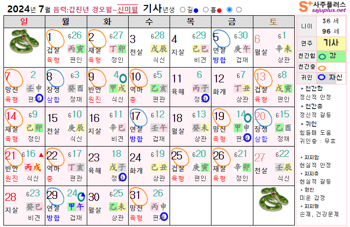 7월 뱀띠 운세 - 2024년 7월 갑진년 신미월 띠별 연령별 사주 운세보기