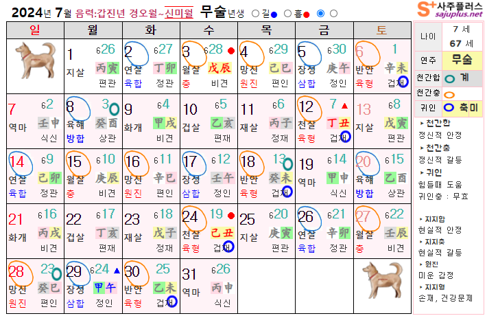 대길 : 양력 7월 24일 (천을귀인, 천간합)
