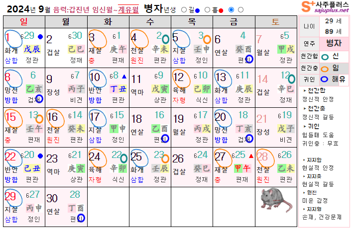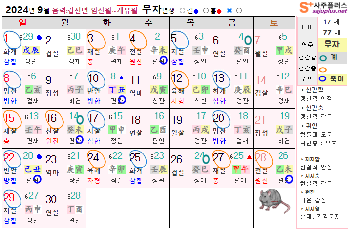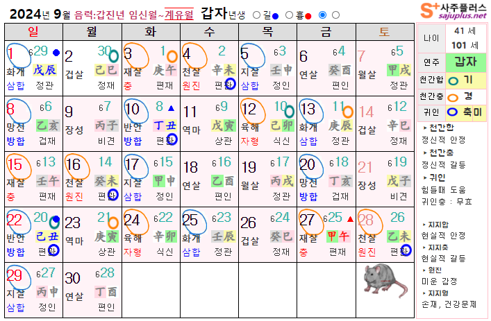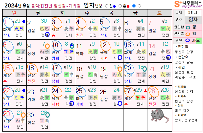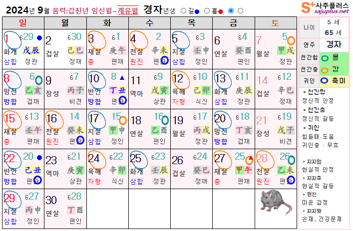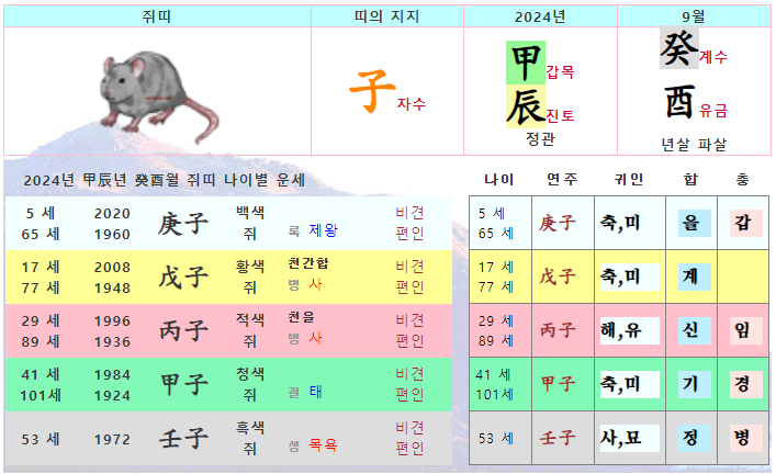 9월 쥐띠 운세 - 2024년 9월 갑진년 계유월 띠별 연령별 사주 운세보기