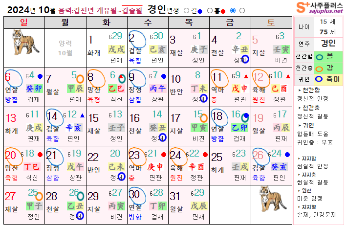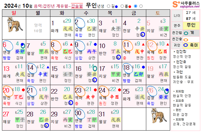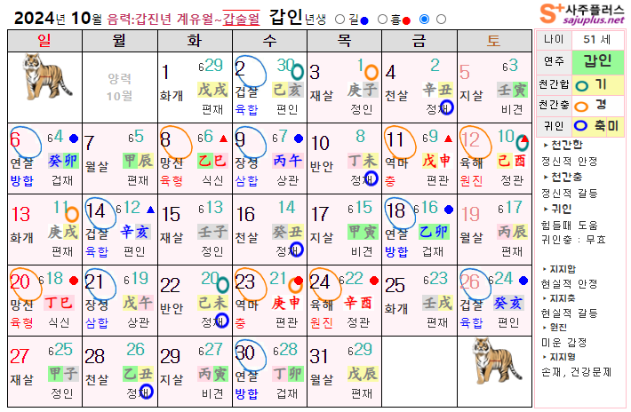 10월 호랑이띠 운세 - 2024년 10월 갑진년 갑술월 띠별 연령별 사주 운세보기