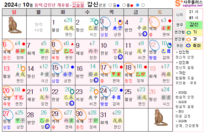 10월 원숭이띠 운세 - 2024년 10월 갑진년 갑술월 띠별 연령별 사주 운세보기