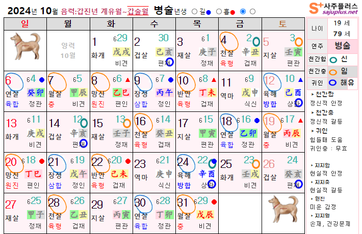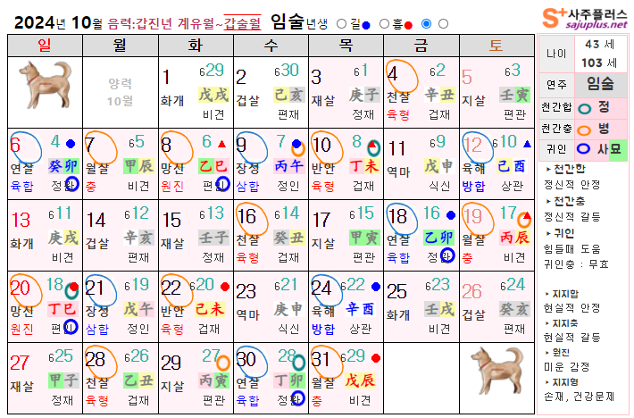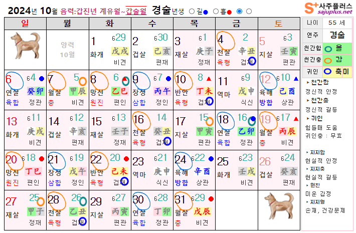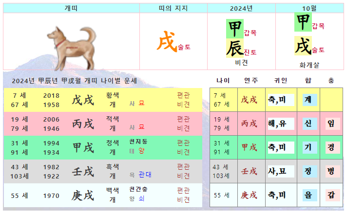 10월 개띠 운세 - 2024년 10월 갑진년 갑술월 띠별 연령별 사주 운세보기