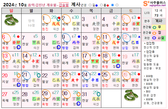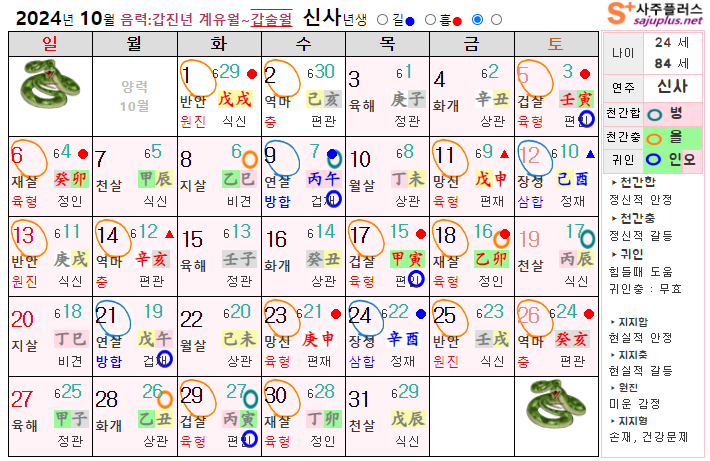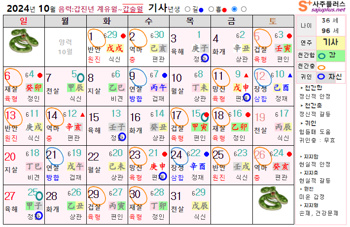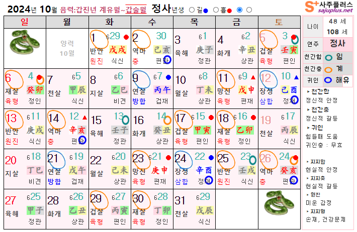 10월 뱀띠 운세 - 2024년 10월 갑진년 갑술월 띠별 연령별 사주 운세보기