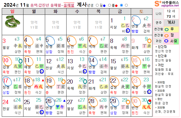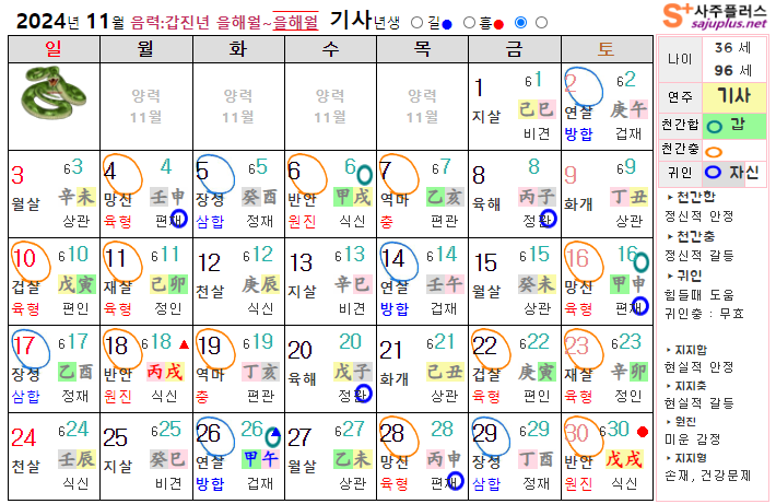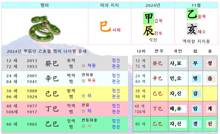 11월 뱀띠 운세 - 2024년 11월 갑진년 을해월 띠별 연령별 사주 운세보기