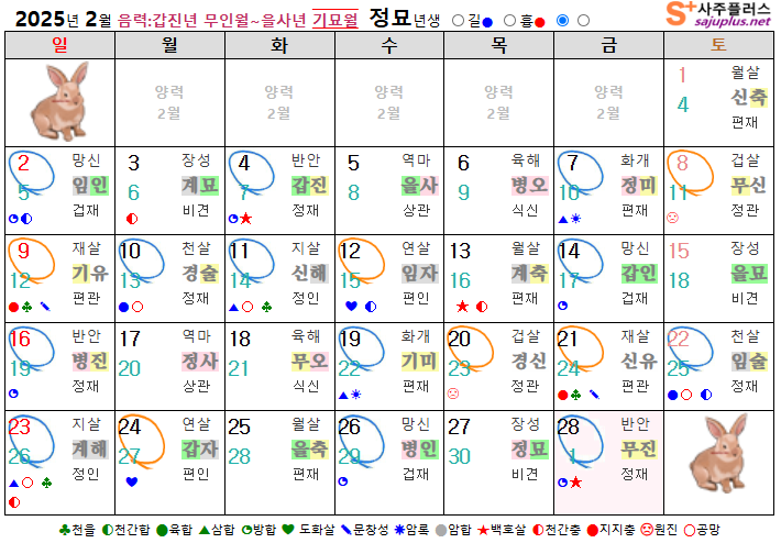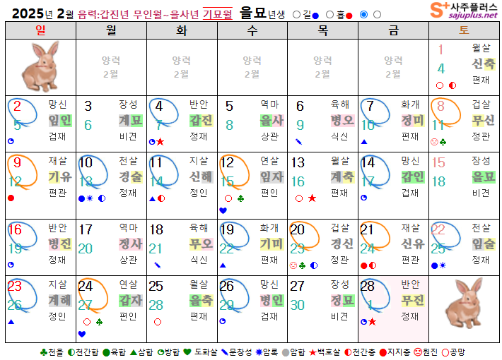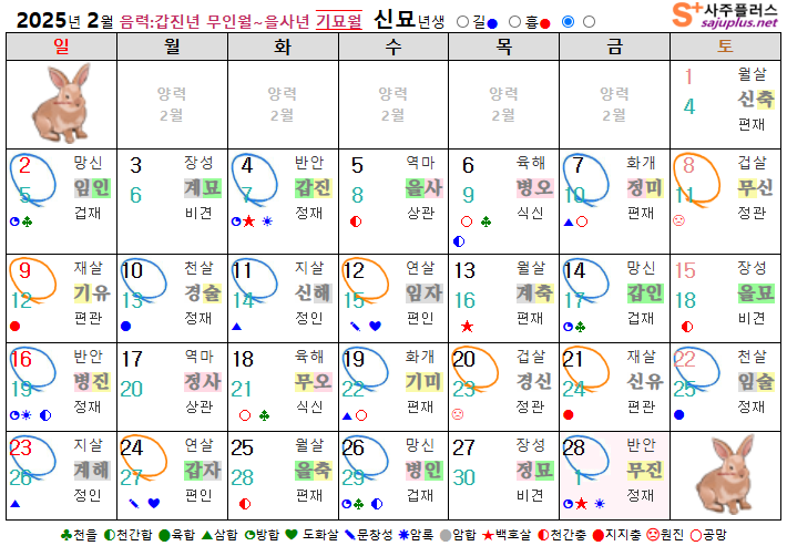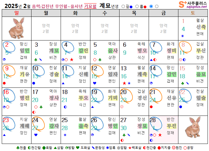 2월 토끼띠 운세 - 2025년 2월 을사년 무인월 띠별 연령별 사주 운세보기