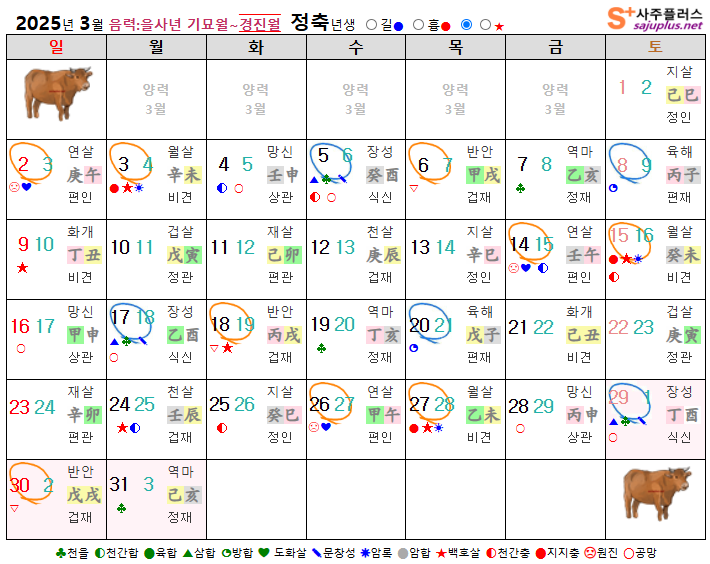 ○ 공망 : 4일, 5일, 16일, 17일, 28일, 29일 (노력에 비해 결실 부족)