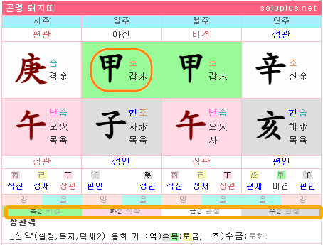 갑목일간에게 토오행은 재성입니다. 원국에 재성이 없으니 재물로 인한 어려움이 생길 수 있고, 남명의 경우라면 여자나 아내와의 인연도 약할 수 있습니다. 참고로, 지장간에는 있는 재성은 운에서 들어오는 경우에 사용할 수 있는 재성으로 봐야 합니다.