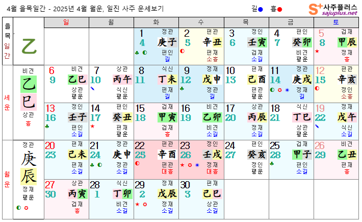 을목일간의 2025년 3월달 일진입니다. 중요한 날, 특히 주의해야 하는 날만 표시해 드리니, 하단의 합,충,형,원진 등의 도표와 첨부한 링크를 참조하셔서 확인하시기 바랍니다.
