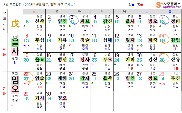 무토일간의 2025년 6월달 일진입니다. 중요한 날, 특히 주의해야 하는 날만 표시해 드리니, 하단의 합,충,형,원진 등의 도표와 첨부한 링크를 참조하셔서 확인하시기 바랍니다.