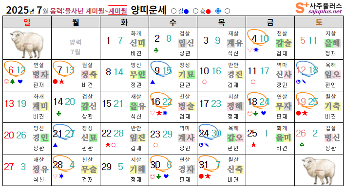 ♣ 천을 : 2일, 6일, 14일, 18일, 26일, 30일 (힘든 순간 주변의 도움)