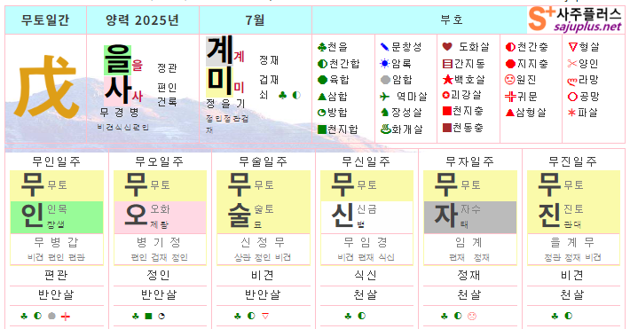 무토일간의 2025년 7월달 일진입니다. 중요한 날, 특히 주의해야 하는 날만 표시해 드리니, 하단의 합,충,형,원진 등의 도표와 첨부한 링크를 참조하셔서 확인하시기 바랍니다.