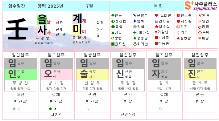 임수일간의 2025년 7월달 일진입니다. 중요한 날, 특히 주의해야 하는 날만 표시해 드리니, 하단의 합,충,형,원진 등의 도표와 첨부한 링크를 참조하셔서 확인하시기 바랍니다.
