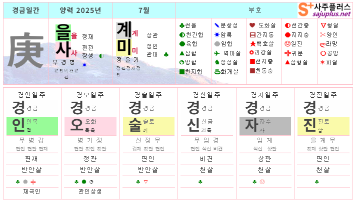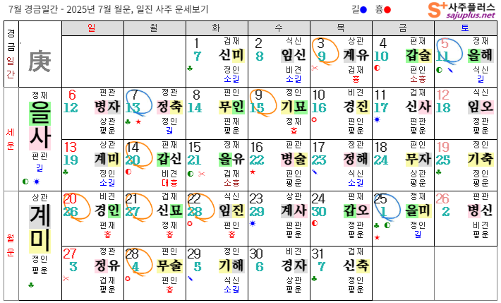 경금일간의 2025년 7월달 일진입니다. 중요한 날, 특히 주의해야 하는 날만 표시해 드리니, 하단의 합,충,형,원진 등의 도표와 첨부한 링크를 참조하셔서 확인하시기 바랍니다.