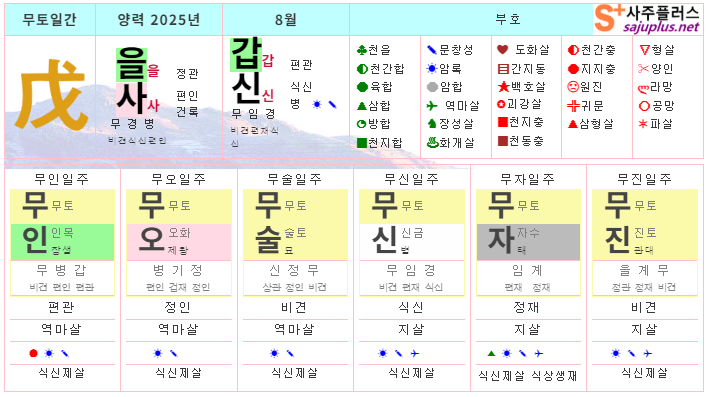 무토일간의 2025년 8월달 일진입니다. 중요한 날, 특히 주의해야 하는 날만 표시해 드리니, 하단의 합,충,형,원진 등의 도표와 첨부한 링크를 참조하셔서 확인하시기 바랍니다.
