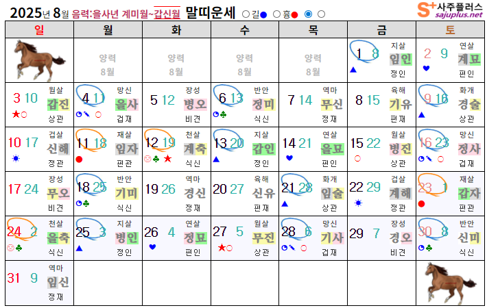 ♣ 천을 : 6일, 12일, 18일, 24일, 30일 (힘든 순간 주변의 도움)